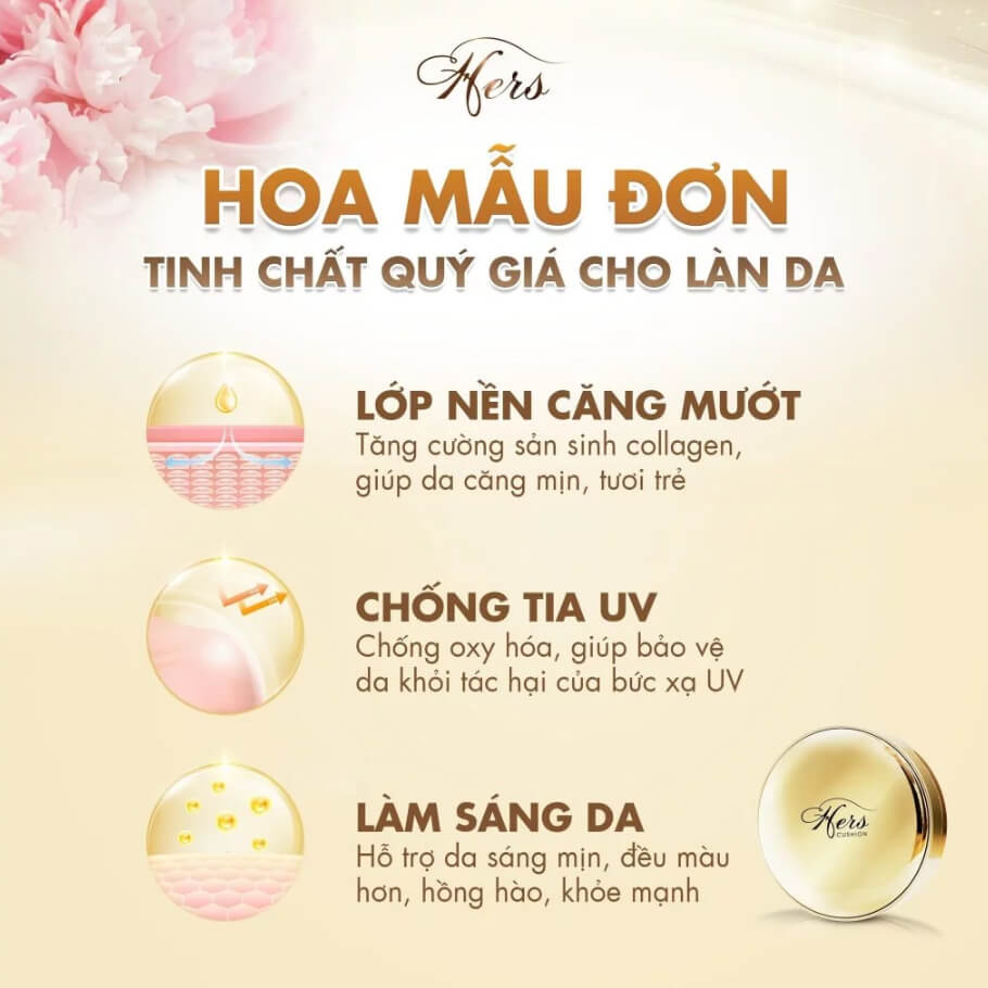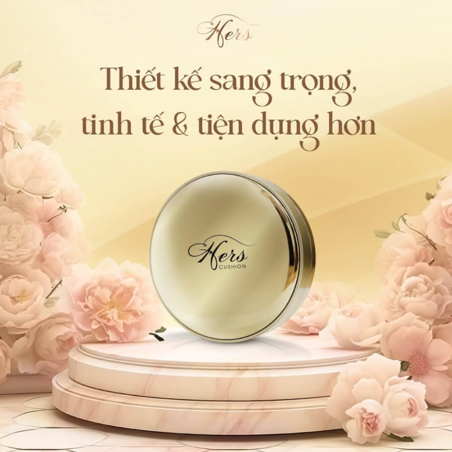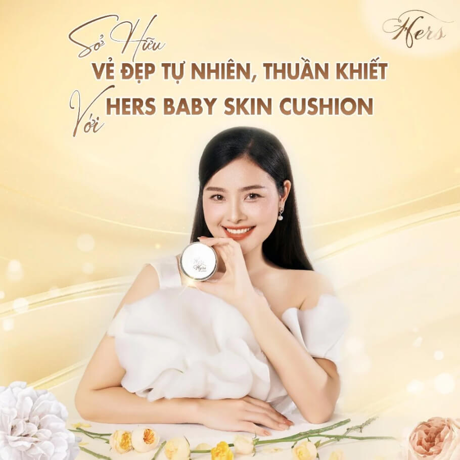 Hers Cushion với các thành phần dầu Jojoba, Vitamin E Acetate,...giúp che khuyết điểm hiệu quả, cho  bạn một lớp nền mịn màng, mỏng nhẹ và trắng hồng tự nhiên