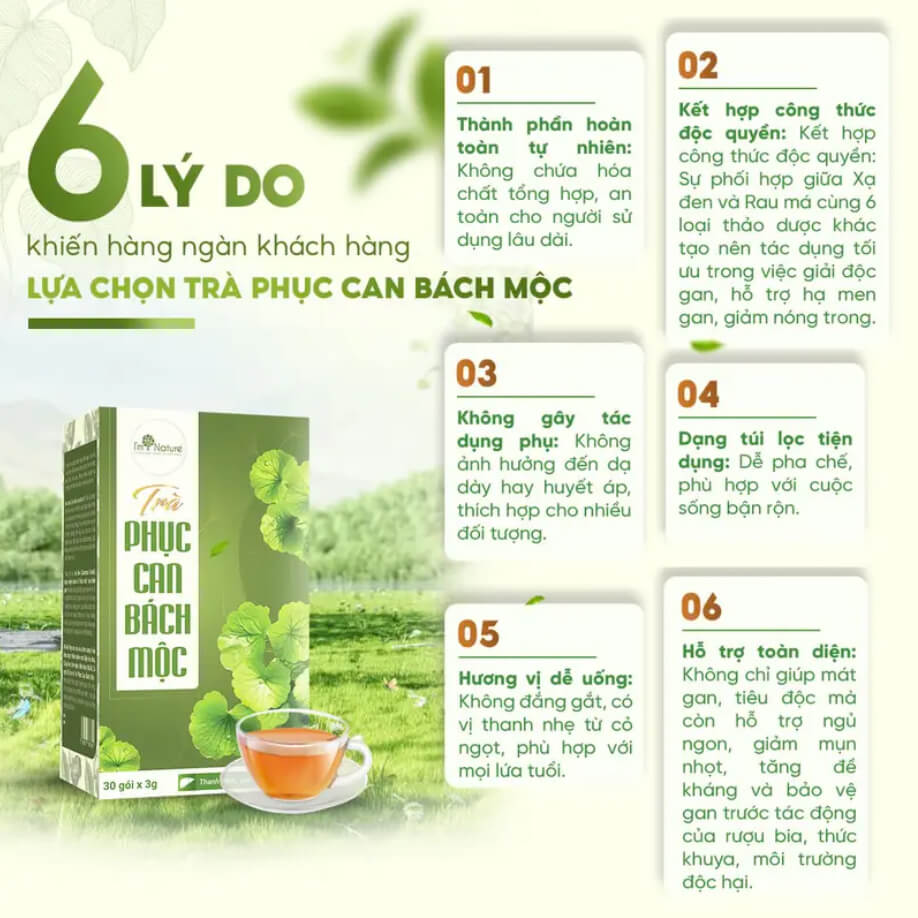 Thanh nhiệt – Giải độc ganNhờ sự kết hợp của Xạ đen, Diệp hạ châu, Cà gai leo và Rau má – những thảo dược nổi tiếng với khả năng giải độc, Trà Phục Can Bách Mộc hỗ trợ làm mát gan, đào thải độc tố ra ngoài, giúp gan “dễ thở" hơn sau những bữa ăn dầu mỡ hay thời gian căng thẳng kéo dài.